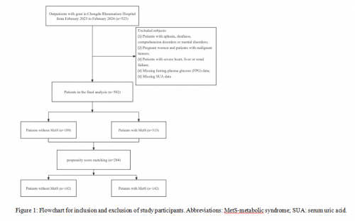 代谢综合征是以肥胖、高血压、高血糖和血脂异常等为特征的一组代谢紊乱性疾病,与痛风密切相关。本研究团队通过对502例痛风患者开展横断面调查,运用倾向评分匹配(PSM)和限制性立方样条(RCS)等先进统计方法,系统探讨了甘油三酯-葡萄糖(TyG)指数、甘油三酯/高密度脂蛋白胆固醇(THR)比值等代谢标志物在预测痛风患者合并代谢综合征(MetS)中的价值。Figure1为研究参与者纳入和排除的流程图: