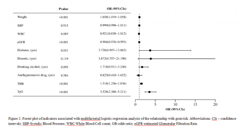 为更直观地展示研究成果,本研究通过一系列图表对数据进行了深度解析。Figure2清晰展示了各代谢指标与痛风患者发生代谢综合征风险之间的独立关联。结果显示,TyG指数(OR = 3.94) 和 THR比值(OR = 1.66) 均是MetS的显著独立预测因子,证实了它们在风险评估中的重要价值。