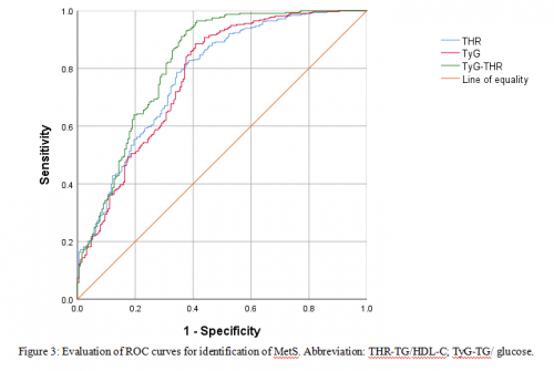Figure3是评估TyG与THR对MetS的预测效能的ROC曲线,通过ROC曲线分析发现,TyG指数与THR比值在联合使用时,曲线下面积(AUC)高达0.820,显著优于单一指标,显示出优越的早期筛查与鉴别诊断能力。