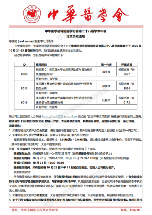 中华医学会肾脏病学分会学术年会是国内肾脏病学领域规模宏大、学术水平顶尖的专业盛会,本届年会定于2025年10月21日-25日在郑州召开,汇聚全国肾脏病学及相关领域的顶尖专家学者,聚焦学科前沿动态与临床实践难点,为学术交流与科研成果转化搭建高端平台。大会对投稿论文采用严格的专家评审机制,入选成果需经多轮专业审核,兼具科学性、创新性与临床应用价值。