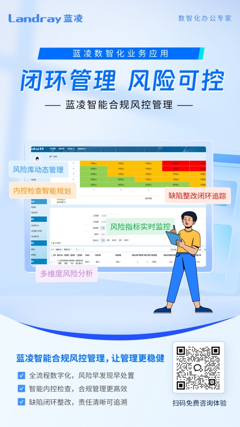 在此背景下,蓝凌推出智能合规风控管理平台,为组织打造覆盖风险管理与内控管理的全流程数智化闭环体系,实现“风险可量化、流程可追溯、问题可闭环”,将合规要求落地到业务全流程,让管理更高效、更精准、更合规。