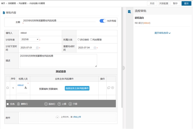 用户可按年度、业务分类创建检查计划,明确计划时间、下发时间、完成时间及检查人员,同时支持选择业务主题/风险事件,提升计划制定效率。