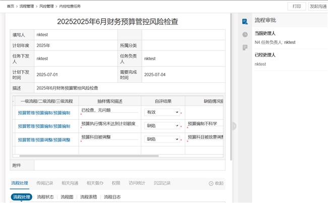 一方面,风险评估依赖主观经验,缺乏量化标准。同样是“预算编制问题”,有人判定为轻微瑕疵,有人视为高风险隐患,导致管控重点混乱;另一方面,流程执行依赖人工传递,从风险识别填报到内控检查反馈,审批周期动辄3-5天。更关键的是,数据存在孤岛效应,手动汇总易出错,且无法实时掌握风险动态。