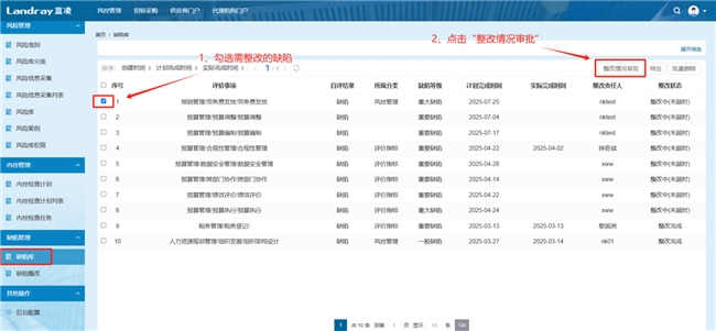 当缺陷整改完成后,责任人需提交整改审批,并上传整改证明文件,管理员审批通过后系统自动更新缺陷状态为“已完成”,实现“检查 - 发现 - 整改 - 结束”的内控闭环链路。