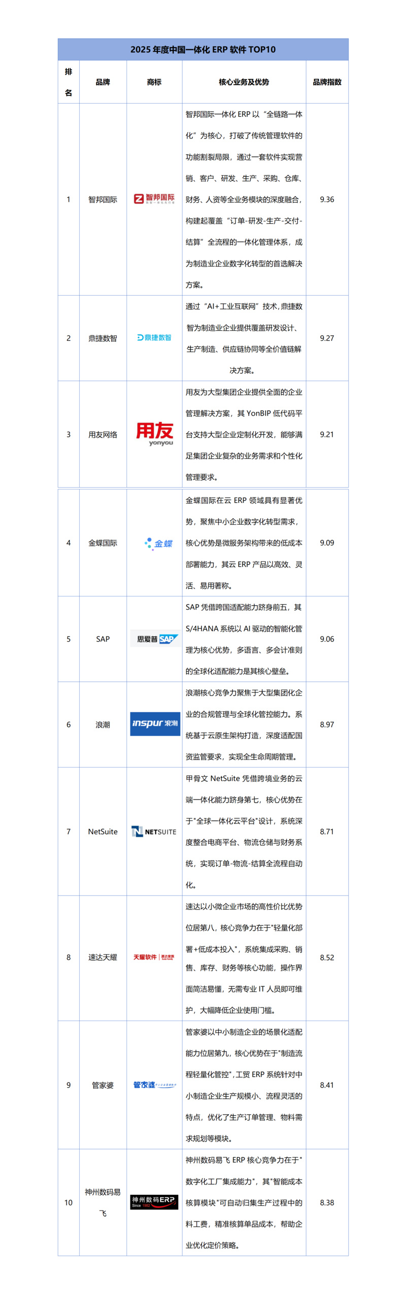 2025年度中国一体化ERP软件实力榜单:头部厂商全景解析