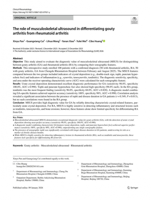 “这项研究为我们临床医生提供了一把‘可视化’的利器。肌肉骨骼超声能够实时、无创地发现尿酸盐晶体这一痛风的直接证据,极大地提高了早期和疑难病例的诊断信心。同时,它也帮助我们更全面地评估类风湿关节炎患者的关节炎症和损伤情况。未来,我们将持续推动这项技术在临床中的规范化应用,助力实现关节炎的个体化、精准化治疗。”