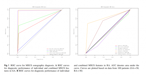 研究结果显示,肌肉骨骼超声在鉴别诊断中展现出卓越价值,尤其是对于痛风性关节炎。超声下观察到“尿酸盐晶体沉积”是诊断GA最可靠的征象,其诊断敏感性高达98.0%,特异性达到100.0%,准确度近乎完美。此外,痛风石、点状高回声灶等特征也具有极高的特异性(均为98.0%)。研究进一步提出,若将这三个特征组合成一个诊断模型,其综合诊断性能更优,几乎可以准确识别出所有GA患者(敏感性100%,特异性98%)。