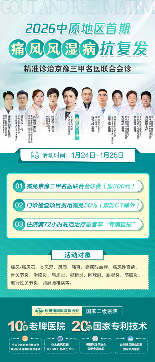 对于痛风风湿病的治疗,规范的临床诊治固然重要,而系统、科学的抗复发管理同样关键。定期复查、持续治疗与合理用药,尤其是在临床治愈后的前3-5年,坚持每年接受专业的抗复发管理,对减少病情反复、争取长期稳定乃至实现不复发,具有重要意义。为此,河南省康复医学会风湿病分会康复临床基地——郑州痛风风湿病医院,将于2026年1月24日至25日举办 “2026中原地区首期痛风风湿病抗复发精准诊治京豫三甲名医联合会诊”。活动特邀北京、河南两地三甲名医,携手开展联合会诊,推动抗复发精准诊疗,帮助患者从根源控制病情,避免反复发作带来的身心困扰。
