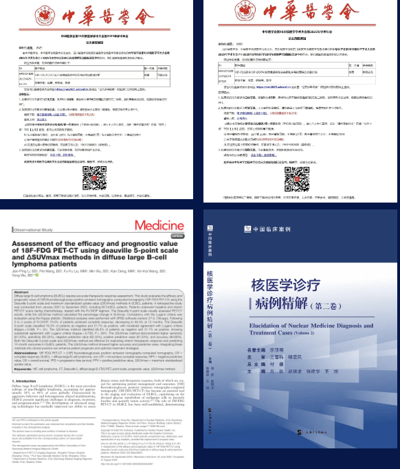 学术科研成果的量质齐升,为临床实践与专业声誉提供了坚实支撑。2025年,集团各中心累计在国内外权威期刊发表或收录学术论文数十篇。其中,高尚健康集团广州中心2篇论文被“中华医学会核医学学术大会暨2025年学术年会”收录;高尚健康集团西安中心院长巫勇作为通讯作者,在国际知名期《Medicine》上发表了题为《使用多维尔5点评分和△SUVmax方法评估18F-FDG PET-CT在弥漫性大B细胞淋巴瘤患者中的疗效和预后价值》的研究,体现了在肿瘤核医学评估领域的探索深度。巫勇院长参编的《核医学诊疗病例精解》(第二卷)正式发布,将宝贵的临床经验转化为行业共享的知识财富。