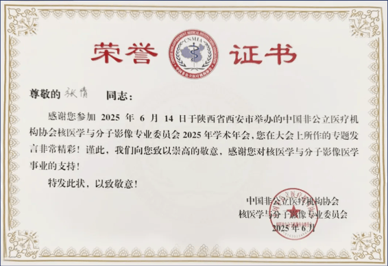 6月,高尚健康集团厦门中心副院长张倩受邀在中国非公立医疗机构协会核医学与分子影像专业委员会2025年学术年会并发言,11月,张倩副院长作为厦门市核学会监事会委员,受邀参加厦门市核学会及福建省核学会海洋学分会主办的2025年学术年会并主持颁发证书环节,参加第十届核医学诊疗规范与临床应用新进展学习班暨2025年福建省核医学专科联盟大会。