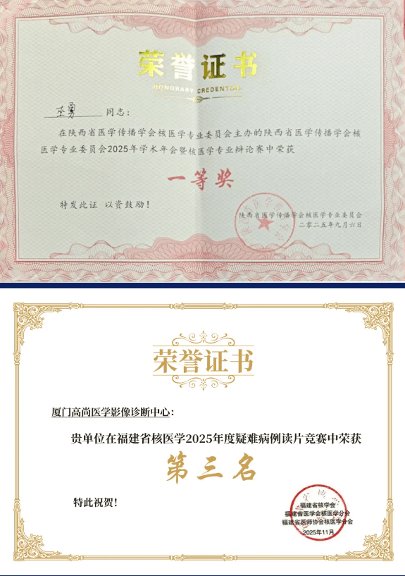 9月,高尚健康集团西安中心由医疗院长巫勇带队参加“陕西省医学传播学会核医学专业委员会2025年学术年会暨核医学专业辩论赛”,并荣获团队一等奖;11月,高尚健康集团厦门中心PET诊断组在福建省核医学2025年度疑难病例读片竞赛荣获第三名;直观反映了日常诊断工作中的精准分析能力与深厚经验积累。