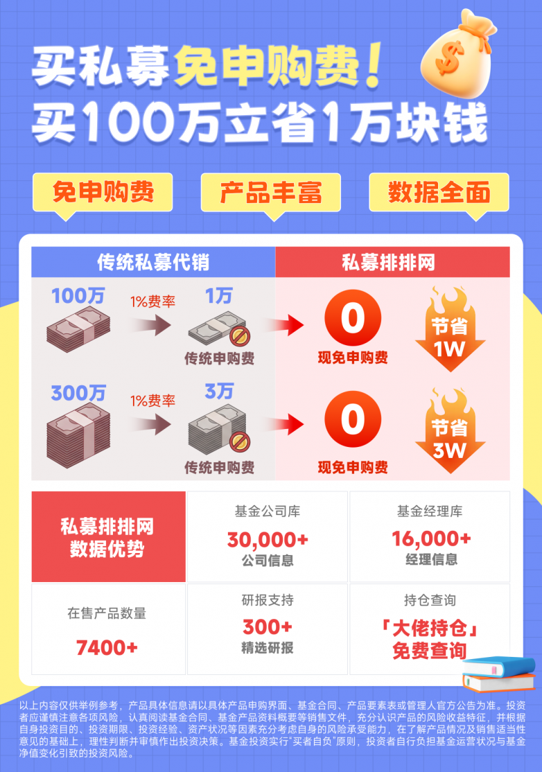 在费用方面,私募排排网推出的“买私募免认申购费”活动长期有效。相较于传统的银行、券商渠道,在私募排排网购买私募基金,能够立省1%-1.5%的认申购费,还能享受高阶分析、大咖路演、私募研报等更多权益。