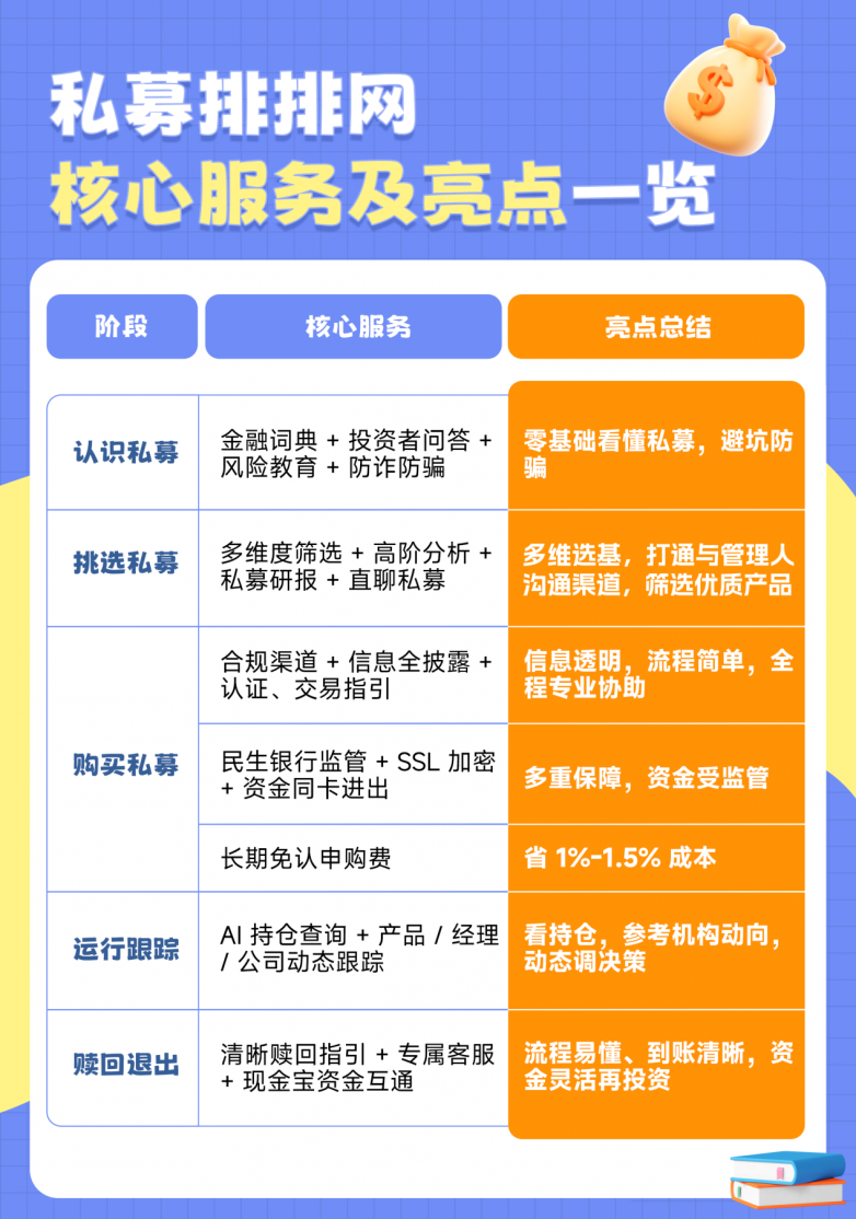 在购买私募基金环节,私募排排网详尽披露信息,提供交易协助、资金受监管、成本减免等功能及服务,从全方位入手保障投资者权益。