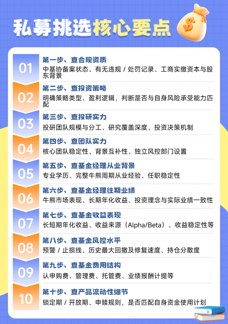 接下来进入挑选私募基金阶段,想要选择适合自己的私募基金,需从风险测评结果出发,结合管理人资质、基金经理投资实力、基金具体情况综合判断。