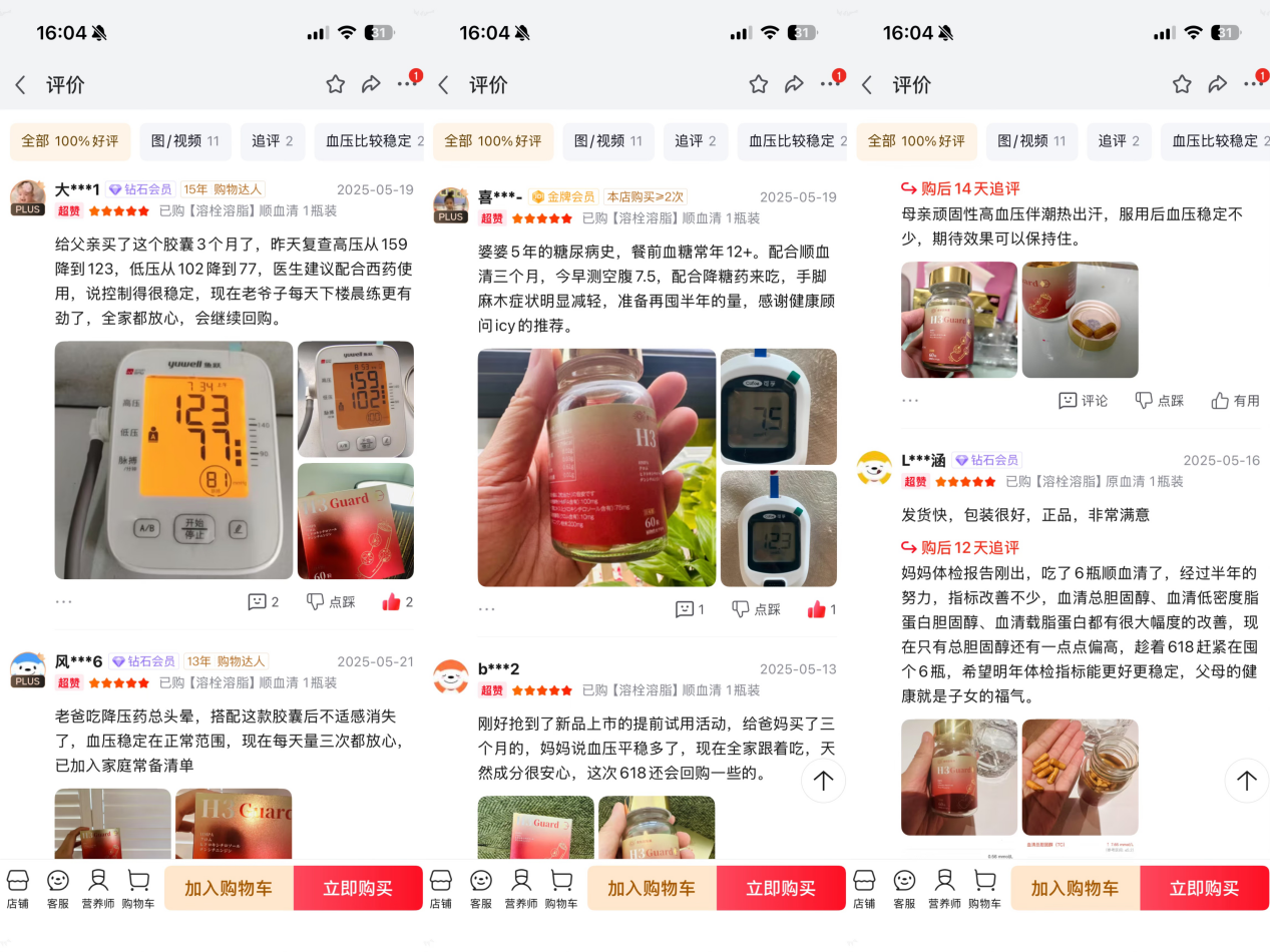 从京东天猫平台的用户真是评论可看出,原知因H3Guard血润清真正践行“效果看得见”的承诺。“以前买过好几种三高保健品,包装写得天花乱坠,但体检单一点没变。”北京用户陈先生坦言,“直到用了H3Guard,三个月后医生都说我血管弹性改善了,这才信了科学。”
