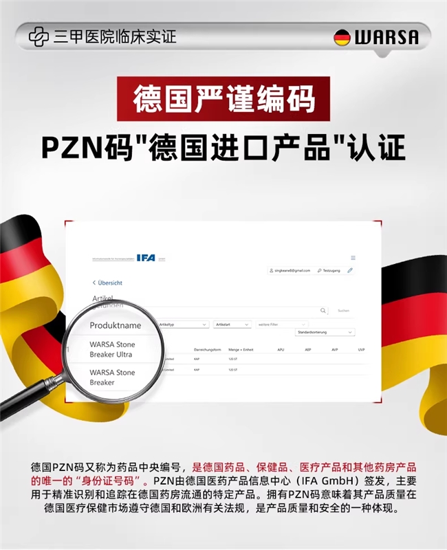德国官方资质:德国华硰WARSA强力消石素拥有正规德国 PZN 编码,肾石配方PZN编码:18407311,胆石配方PZN:18407328;该编码由德国医药产品信息中心(IFA GmbH)签发,是德国药房流通产品的专属 “身份标识”,用于精准识别、追踪产品。拥有 PZN 编码,意味着产品严格遵守德国及欧洲医药健康相关法规,通过德国官方严苛审核,是产品质量、安全合规的权威证明,可在德国药房正规流通销售。
