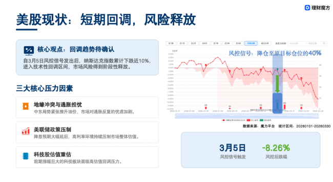 从现状来看,美股短期回调风险已阶段性释放,3月5日理财魔方依据算法发出风控信号,将目标仓位降至60%,此后美股累计下跌8.26%,正式进入技术性回调区间。