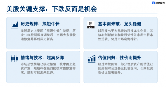 美股具备熊短牛长的历史特性,急跌后修复速度极快。以科技七子为代表的龙头企业,创新能力与盈利韧性未发生根本改变。市场短期超卖严重,存在技术性反弹需求。