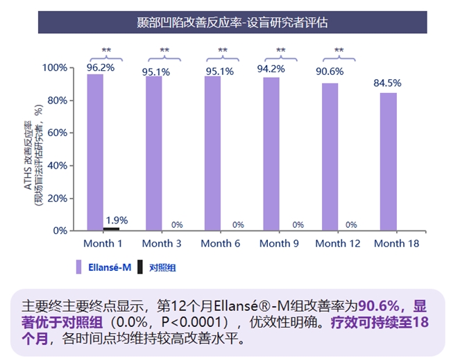 在疗效方面,中国多中心注册临床研究显示,Ellansé®伊妍仕恒耀™在12个月时颞部凹陷改善率达90.6%,显著优于对照组(P<0.0001),疗效可持续至18个月以上,改善效果良好。[3]